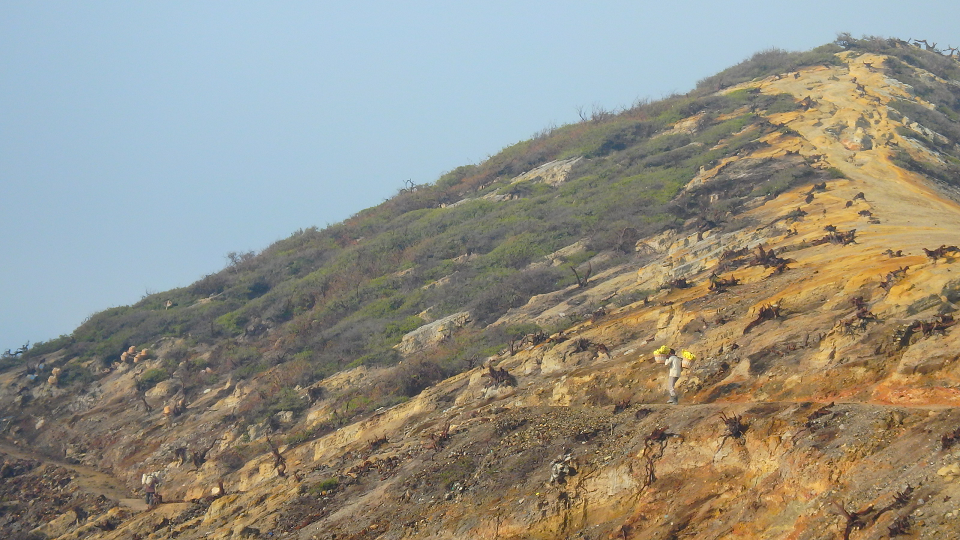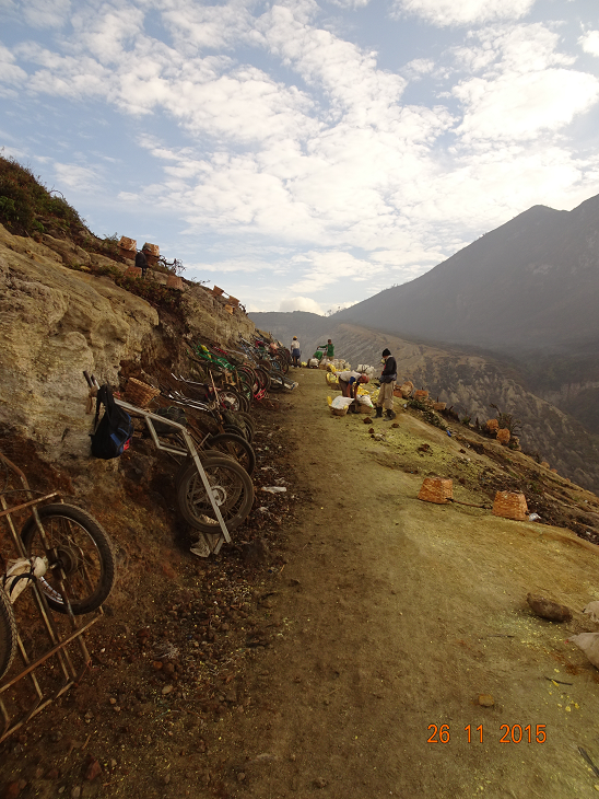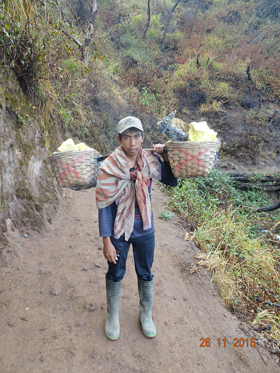 Ce fut dur, très dur, mais personne n’osait se plaindre car nous croisions les porteurs de soufre qui eux en étaient à leur 2ème voyage. Ils montent avec des chariots, descendent jusqu’au cratère et remontent avec des paniers d’environ 70 kg sur leurs épaules ! Ils remplissent leurs sacs et redescendent au village avec entre 150 et 200 kg sur le chariot…