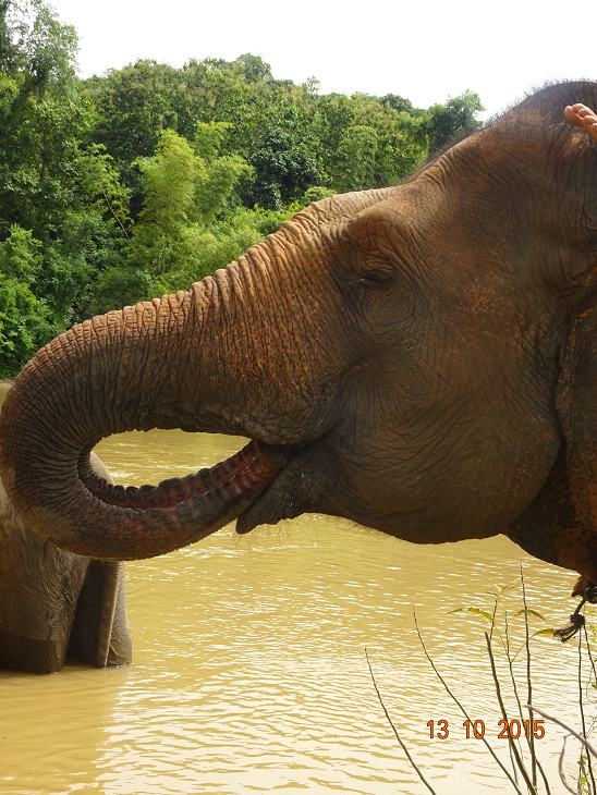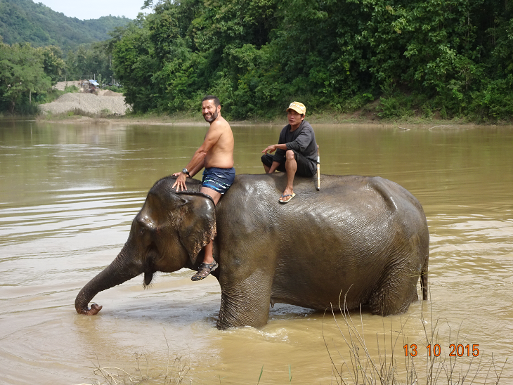 Pour nous, ce fut une belle découverte : après la petite balade en famille, les garçons sont allés prendre le bain avec les éléphants. C'était vraiment impressionnant et pas toujours facile de garder l'équilibre. D'où les petites inquiétudes de Raphaël, d'autant plus que son compagnon l'a aspergé de nombreuses fois !