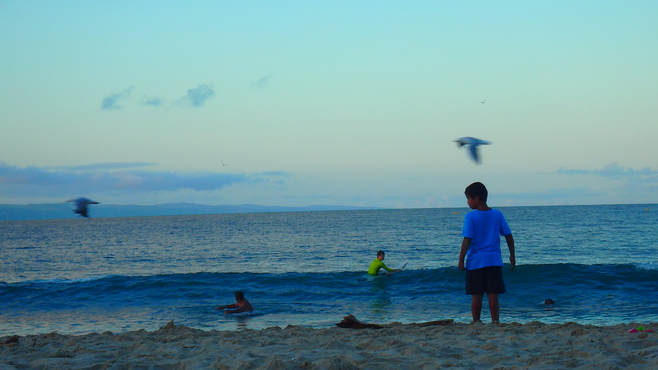 Papa prend la vague, mouette au-dessus de moi.