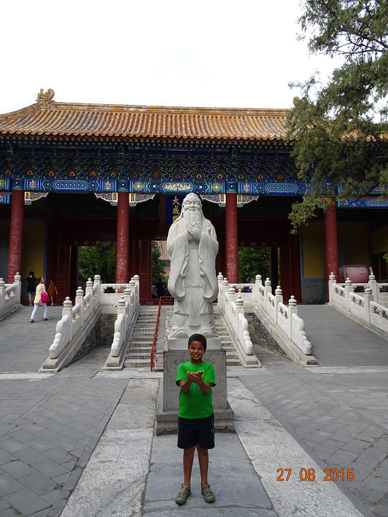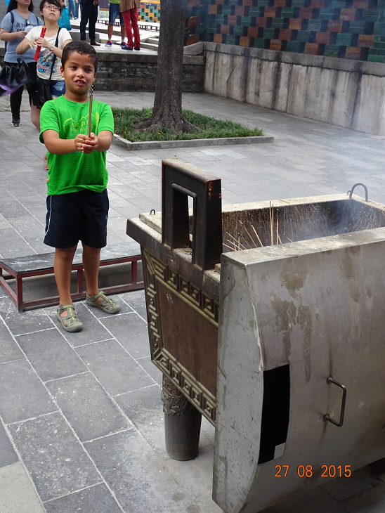 Nous sommes allés voir la grande muraille (à 2h de Pékin), le temple des lamas et celui de Confucius. J’ai fait brûler beaucoup d’encens et prié pour vous !