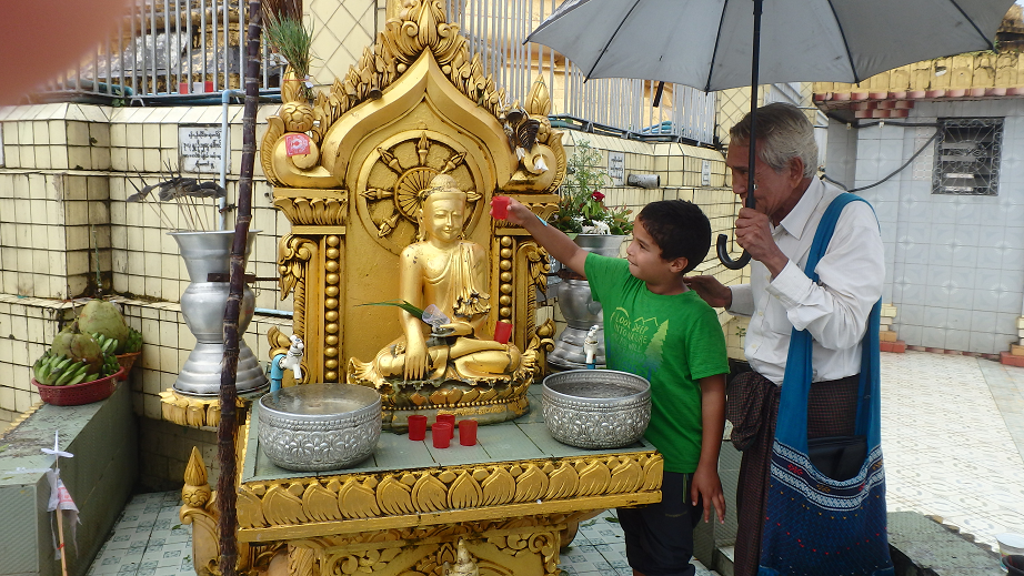 Papa, Maman et moi, nous avons lavé le bouddha du jour de notre naissance. Le Monk nous a expliqué qu’il fallait le laver 5 fois :