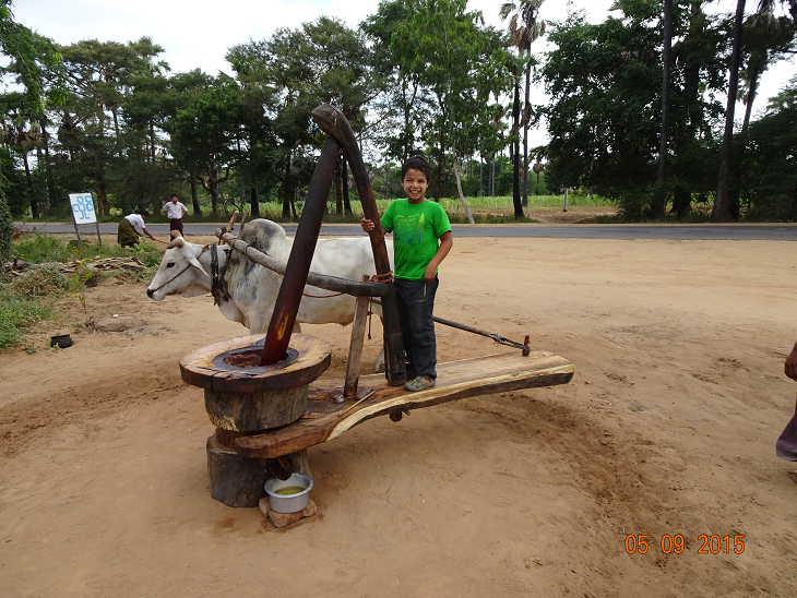 Sur les routes vers le Mont Popa, méthode ancestrale pour faire de l'huile d'arachide.