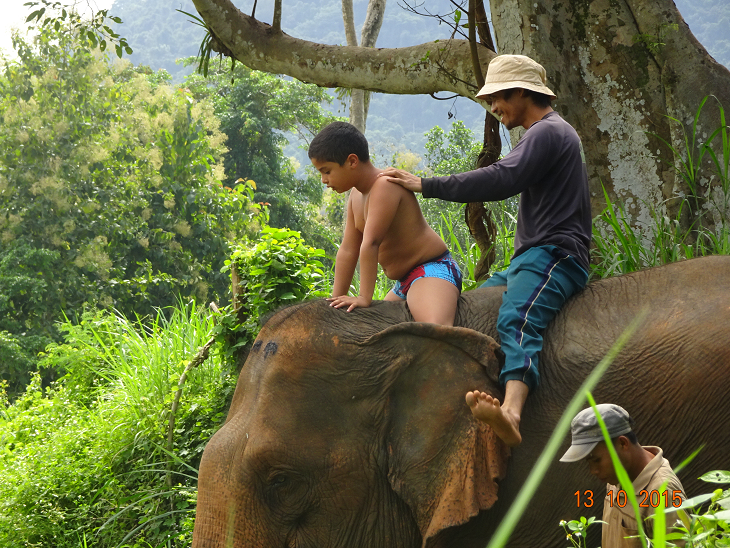 Nous avons d’abord fait une balade à dos d’éléphant tous les 3. Puis, avec Papa, on est montés chacun sur un éléphant avec un guide et nous sommes allés à la rivière.