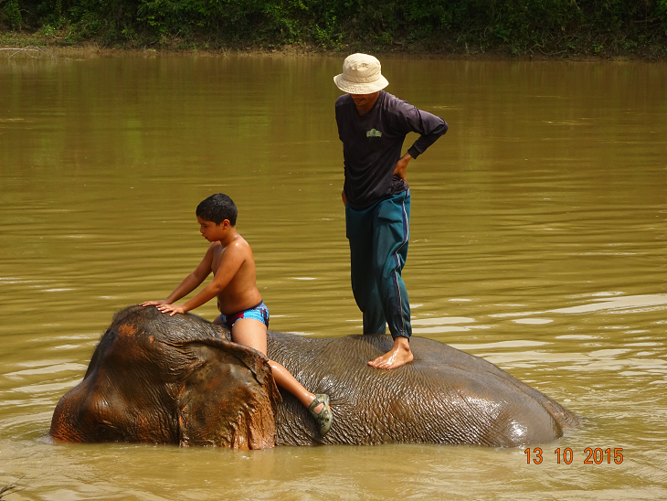 Mon éléphant m’a arrosé plusieurs fois avec sa trompe et s’est baigné complètement, j’étais trempé ! Heureusement que j’étais en maillot de bain.