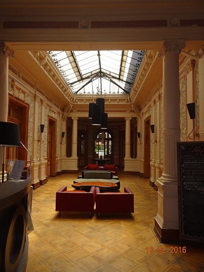 Notre très belle auberge avec de hauts plafonds même dans les chambres.